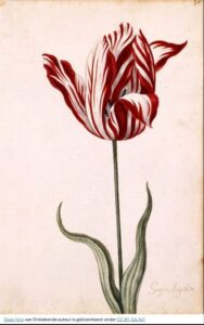 Van de tulp ontstonden variëteiten die groot succes hadden. De bollen waren zeer gewild en schilderijen met afbeeldingen van allerlei soorten tulpen waren populair! In de 17e eeuw ontstond een ware “Tulpen manie”: er werd flink met tulpenbollen gespeculeerd. Er werden duizenden guldens voor neergeteld! Een bol van de variëteit Semper Augustus (zie afbeelding) bracht een bedrag op ter hoogte van het jaarsalaris van de gemiddelde Amsterdammer! De bollen werden gezien als een veilige belegging. Dat bleef niet zo: in 1637 zakte de markt plotseling in, vele speculanten berooid achterlatend. Naar verluidt was een van de slachtoffers de leermeester van Jan Steen, de in Leiden geboren schilder Jan van Goyen.
