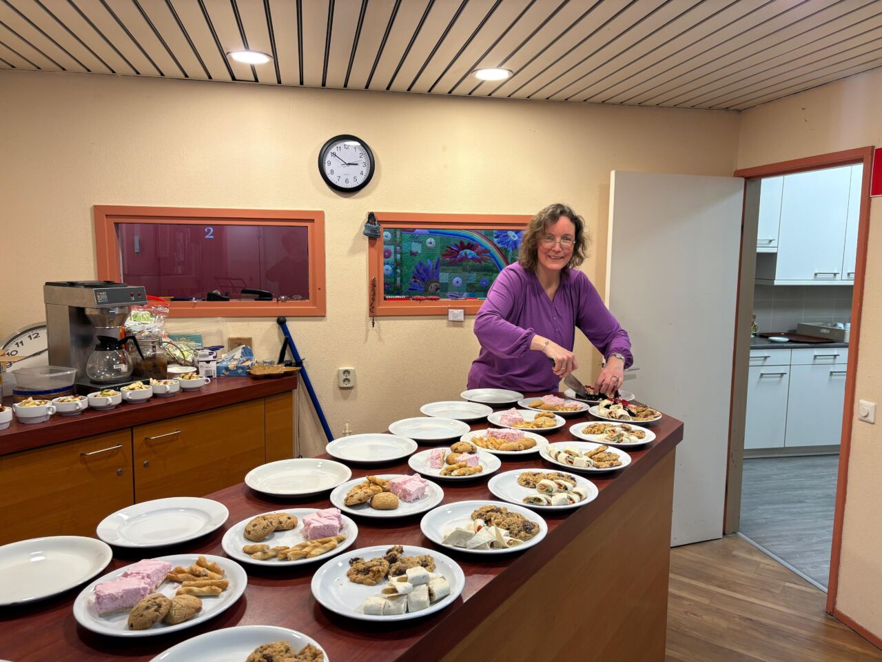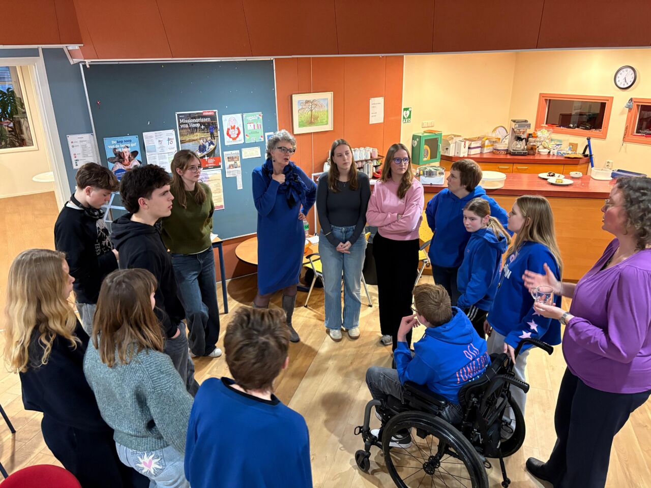 Er waren 11 jongeren die onder leiding van Jutta Harthoorn de lekkerste dingen hadden gemaakt (hartig en zoet) en die met grote inzet aan tafel de gesprekken leidden. Dat viel niet altijd mee, de koffieruimte bleek eigenlijk te klein voor het aantal mensen, waardoor je elkaar niet altijd zo goed kon verstaan. Zowel oud als jong hadden daar wat last van. Maar het mocht de pret niet drukken: in drie rondes werd er geanimeerd gesproken over het thema Hoop. Er waren in elke ronde, waarin je met nieuwe mensen aan tafel zat, een aantal vragen en citaten, zodat je kon kiezen waarover je in gesprek ging. Soms waren er grote verschillen in beleving tussen jong en oud, maar er waren ook overeenkomsten, bijvoorbeeld over muziek naar aanleiding van de vraag: welk lied geeft je hoop?
